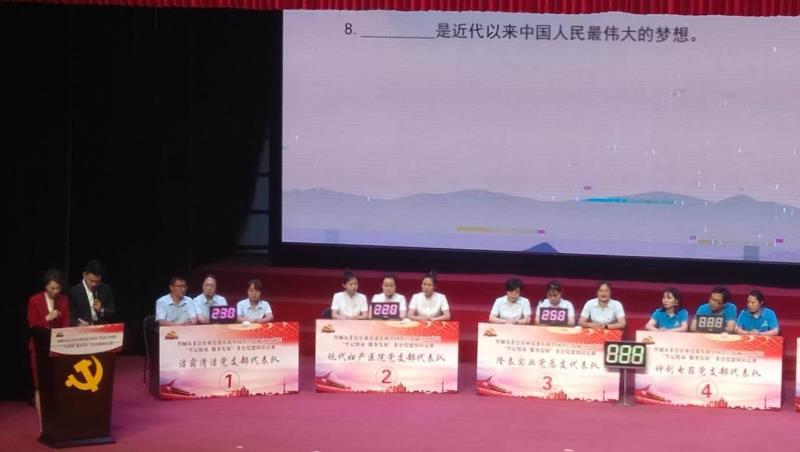 不忘初心跟黨走,牢記使命譜華章!為了慶祝中國共產(chǎn)黨成立99周年,6月28日下午,晉城市非公企業(yè)黨委在澤州天泰錦辰煤業(yè)有限公司職工文化宮進行了一場別開生面的“牢記使命 服務(wù)發(fā)展”黨建知識競賽。潔霸清潔黨支部、現(xiàn)代婦產(chǎn)醫(yī)院黨支部、隆泰實業(yè)黨總支、神利電器黨支部、眾宸工貿(mào)黨支部和蔬菜公司黨支部等六支代表隊在此激戰(zhàn)正酣,各代表隊你追我趕,斗志昂揚,不甘落后,力爭上游,最終,我公司支部代表隊榮獲比賽三等獎。
