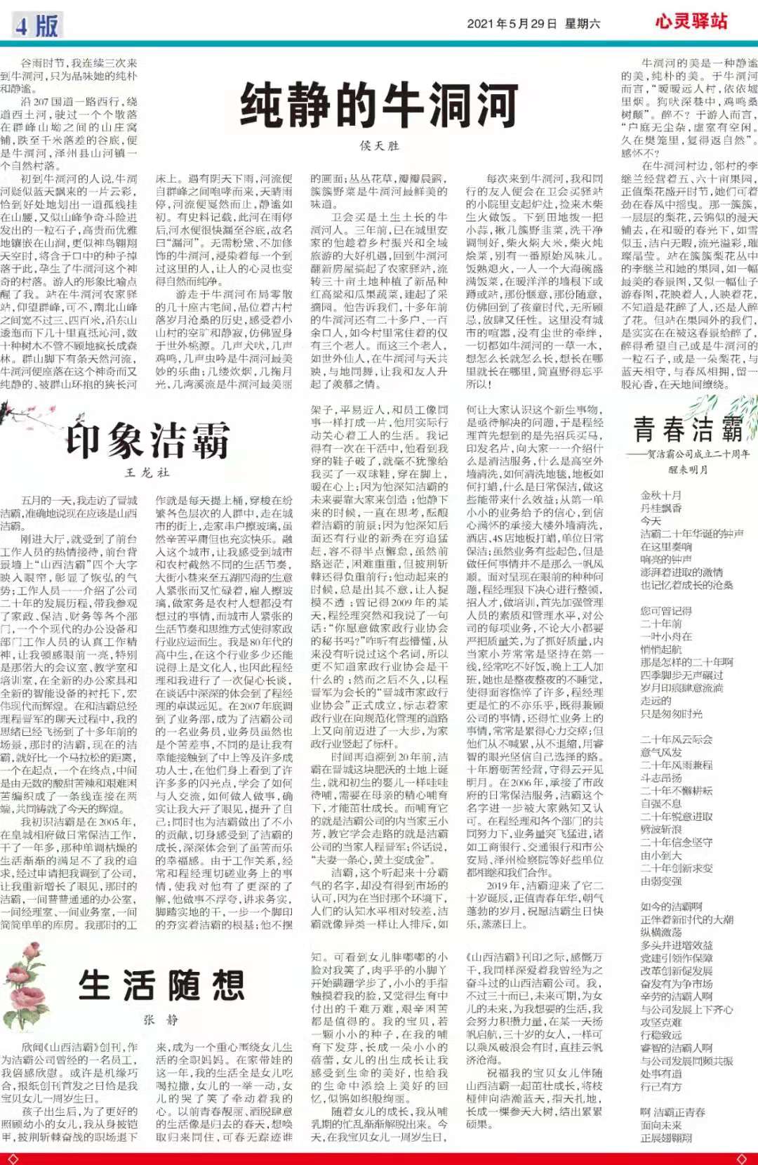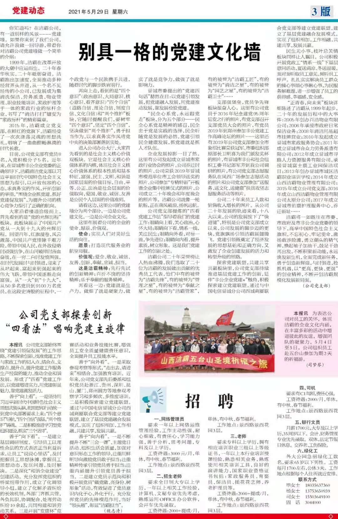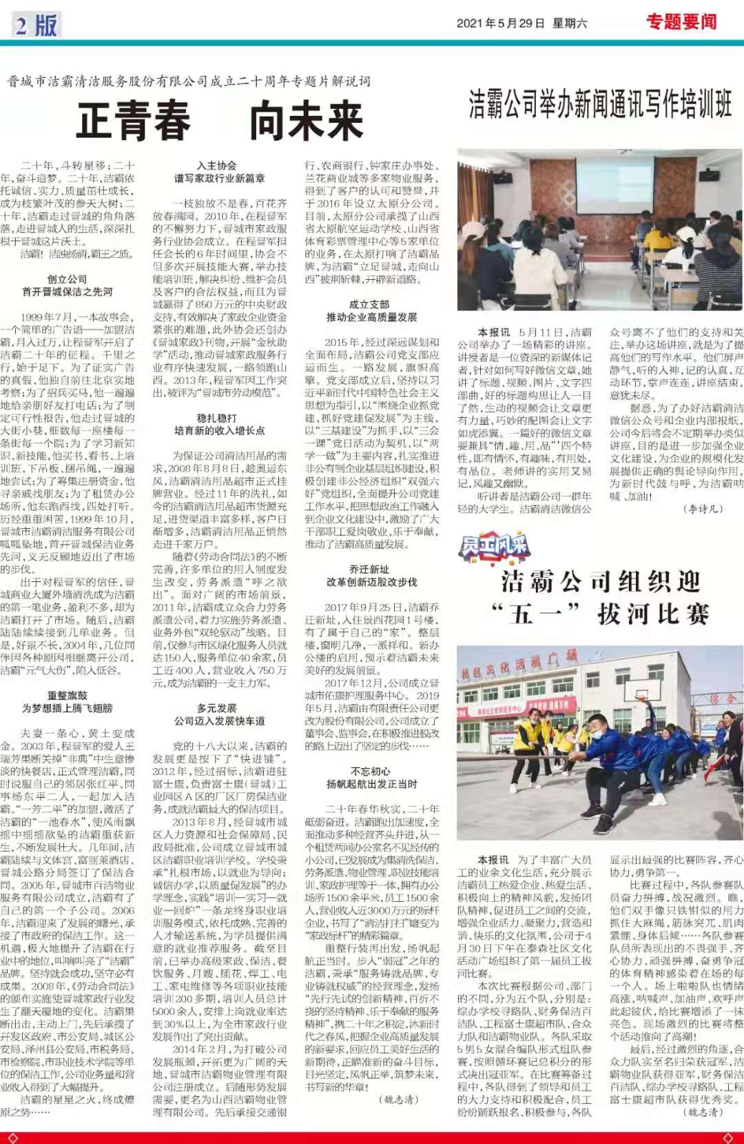 今天是2021年5月29日,經(jīng)過一個多月的緊張籌辦,《山西潔霸》報(bào)紙終于創(chuàng)刊啦!這是潔霸人的一件大喜事,也是潔霸人的驕傲!伴隨著《山西潔霸》紙質(zhì)版的內(nèi)部發(fā)行,電子版也同步與你見面了。希望你能通過這個宣傳窗口,更好地走近潔霸,了解潔霸,關(guān)注潔霸,支持潔霸。