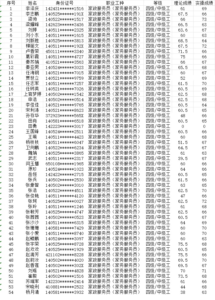 晉城市潔霸清潔服務(wù)股份有限公司職業(yè)技能等級(jí)認(rèn)定中心現(xiàn)將2024年1月21日認(rèn)定人員成績(jī)公示如下: