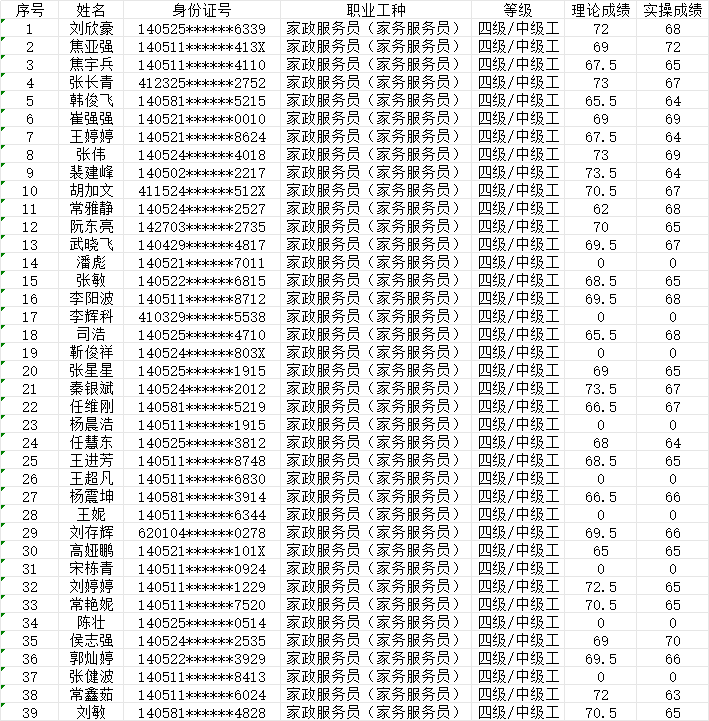 2024年1月28日第8批家政服務員中級認定人員成績公示