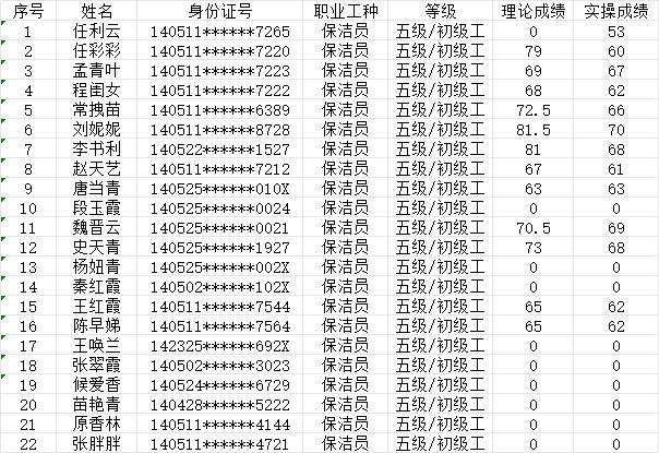 晉城市潔霸清潔服務(wù)股份有限公司職業(yè)技能等級認定中心現(xiàn)將2024年9月15日認定人員成績公示如下: